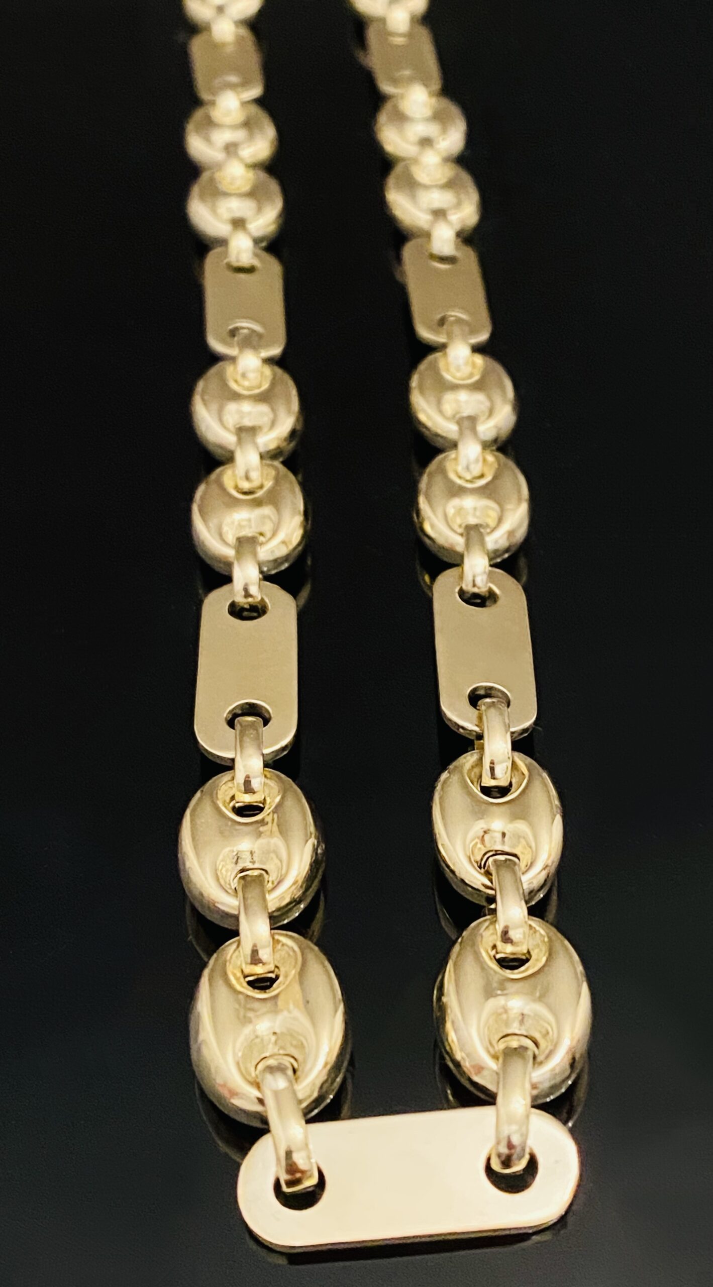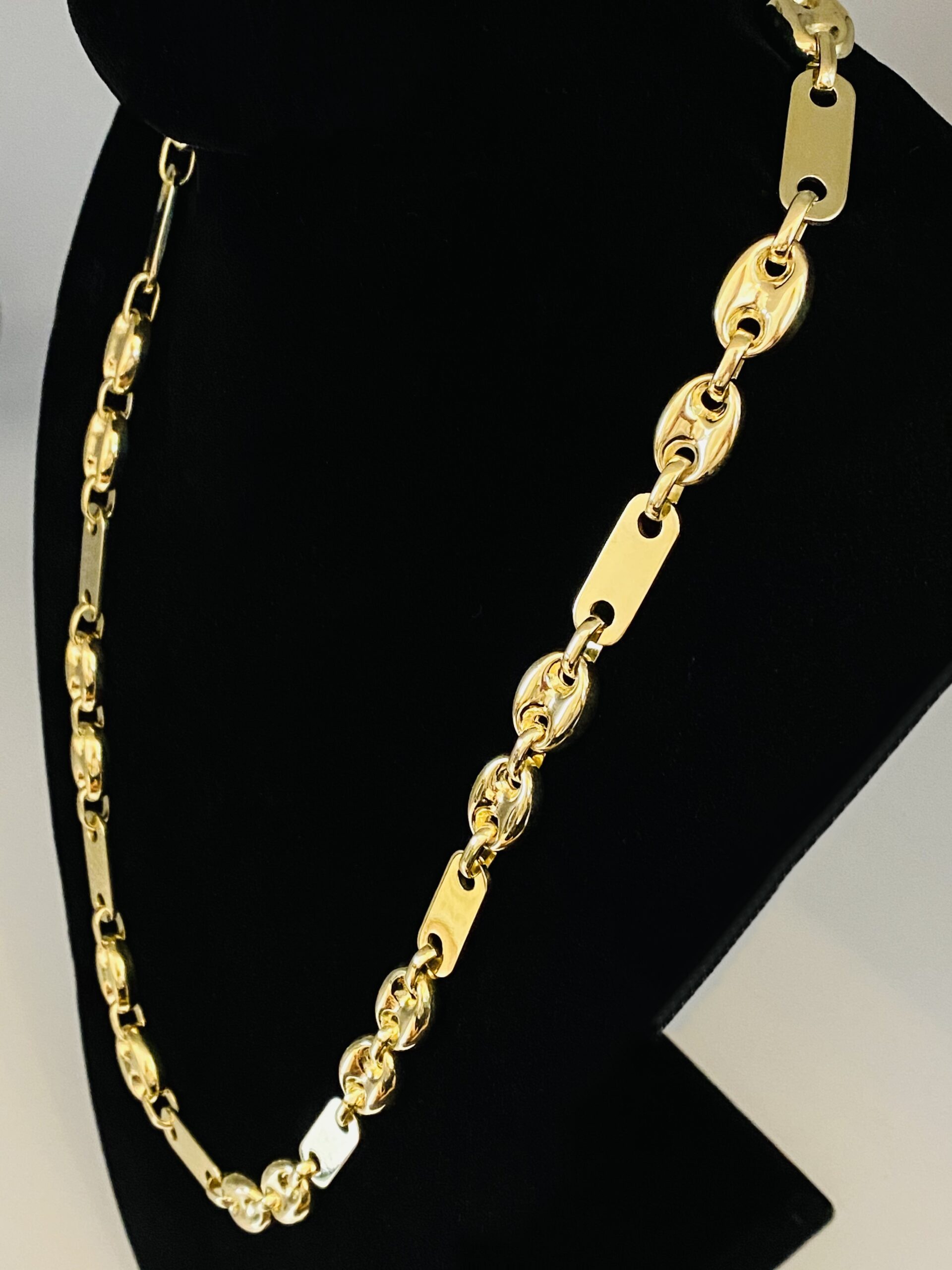 Plattenbohnenkette neu und ungetragen aus 585/14 Karat Gelbgold. Wunderschön und Milimimeter genau verarbeitet.Mit beweglichen Steigbügel/Glieder.Massiv.Echtheitszertifikat mit ausführlicher Beschreibung ist mit dabei.