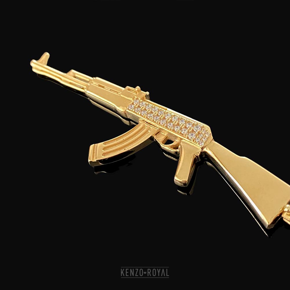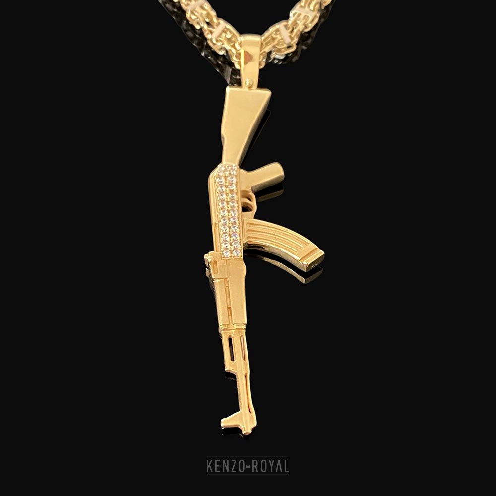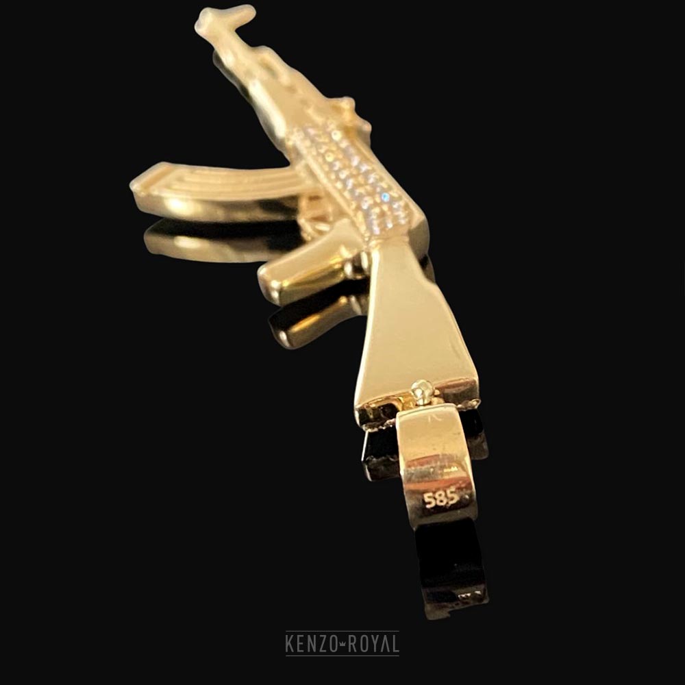 Goldanhänger AK-47 585/14 Karat Gelbgold mit funkelnden Zirkonia Steinen besetzt. Die Krone ist aus Weissgold und ist ebenfalls mit funkelnden Zirkonia Steinen besetzt.